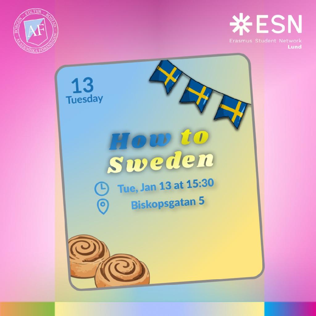 ESN Lund invites you to “How to Sweden”, an informational event filled with insights from other international students, who once had to adjust to the Swedish way of life as well, and know exactly what you need to be aware of. You can expect to hear about Swedish culture in general, but also tips for settling in Lund, the student life, certain practicalities, and of course our favourite food places, hangout spots, and trip recommendations.